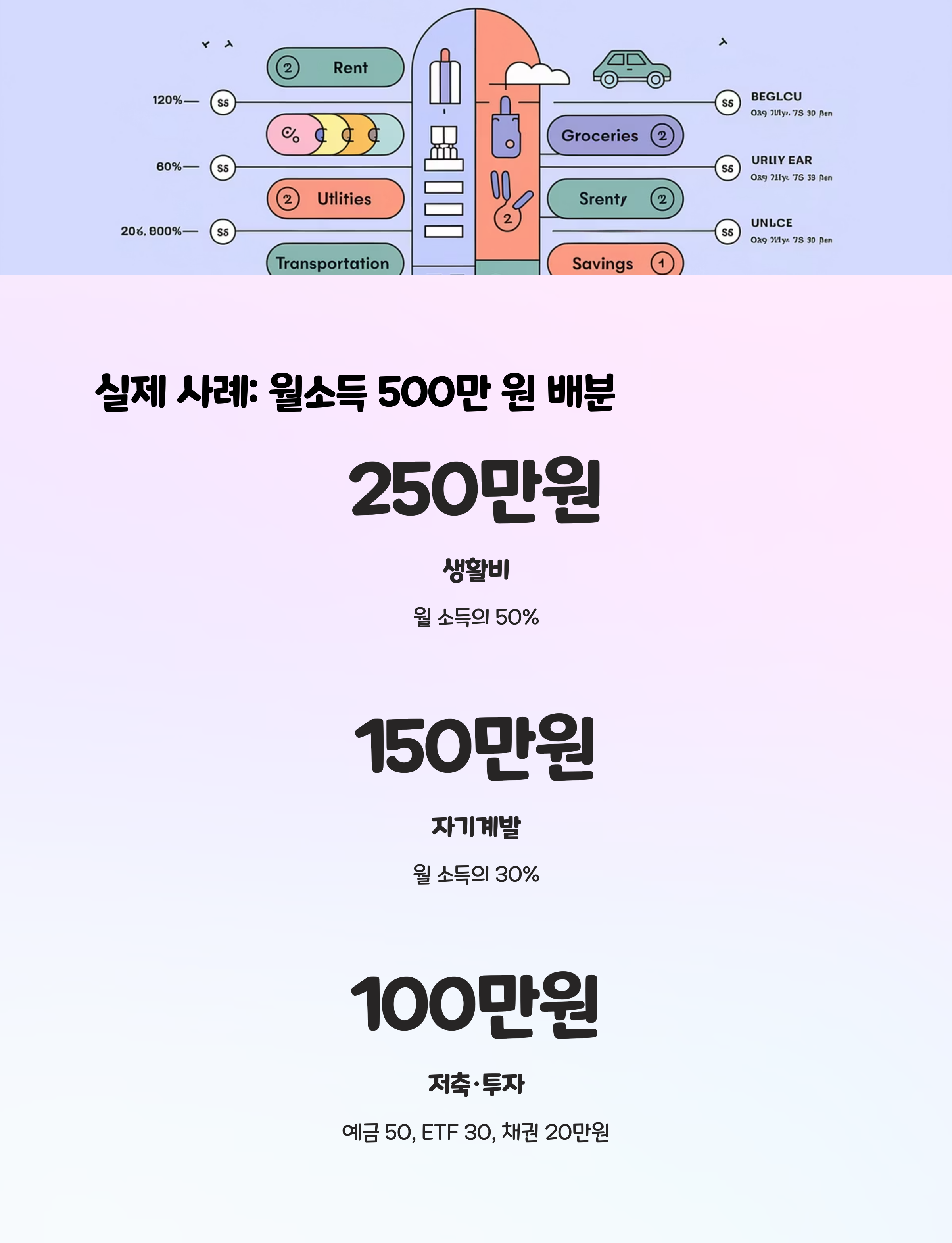 - 50% 필수지출: 주거비, 식비, 교통비 등